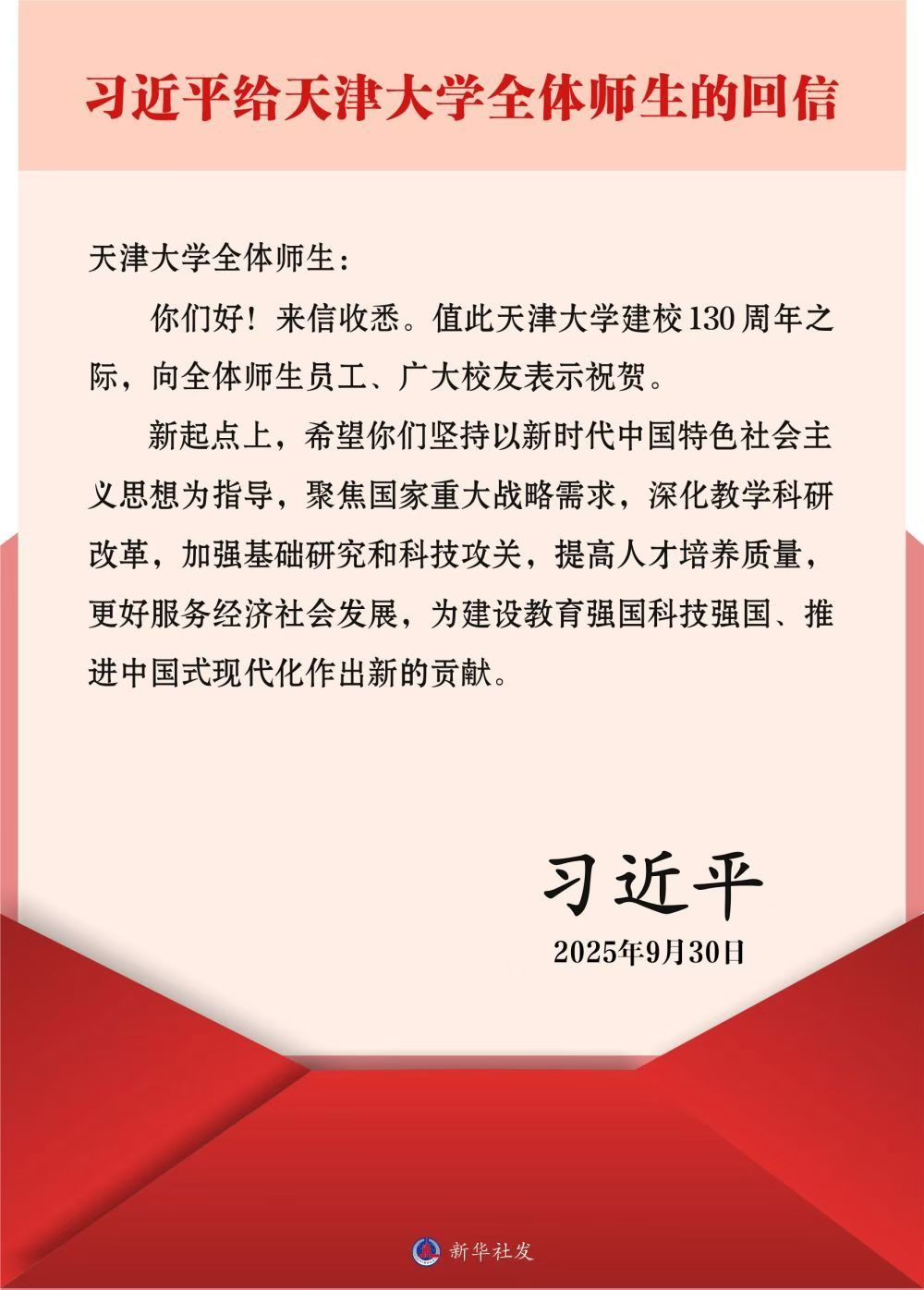 你們好!來信收悉。值此天津大學建校130周年之際,向全體師生員工、廣大校友表示祝賀。