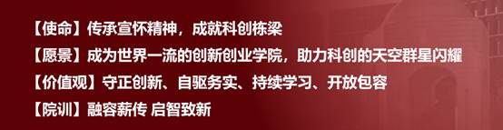 學院秉承“融容薪傳,啟智致新”的院訓,以“傳承宣懷精神,成就科創(chuàng)棟梁”為使命,培養(yǎng)兼具卓越創(chuàng)新精神和實踐能力的未來創(chuàng)業(yè)家。堅守“守正創(chuàng)新、自驅(qū)務(wù)實、持續(xù)學習、開放包容”的核心價值觀,致力于教育卓越與創(chuàng)新引領(lǐng),矢志成為世界一流的創(chuàng)新創(chuàng)業(yè)學院,助力科創(chuàng)的天空群星閃耀。