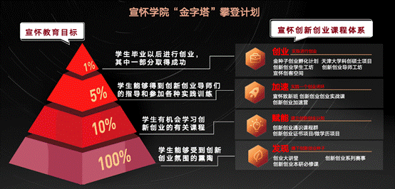 同時,天津大學宣懷學院以"四個百分比"為創(chuàng)業(yè)教育目標,構(gòu)建了獨具特色的創(chuàng)新創(chuàng)業(yè)人才培養(yǎng)體系,即通過創(chuàng)新創(chuàng)業(yè)生態(tài)建設(shè),讓天津大學100%的學生能夠受到創(chuàng)新創(chuàng)業(yè)氛圍的熏陶,10%的學生有機會學習創(chuàng)新創(chuàng)業(yè)的有關(guān)課程,5%的學生能夠得到創(chuàng)新創(chuàng)業(yè)導師們的指導和參加各種實踐訓練, 1%的學生畢業(yè)以后進行創(chuàng)業(yè),其中一部分取得成功。圍繞這一目標,學院創(chuàng)新推出"金字塔攀登計劃",實現(xiàn)創(chuàng)新創(chuàng)業(yè)人才“發(fā)現(xiàn)—賦能—加速—創(chuàng)業(yè)”、從理論到實踐再到實戰(zhàn)的進階式培養(yǎng)。