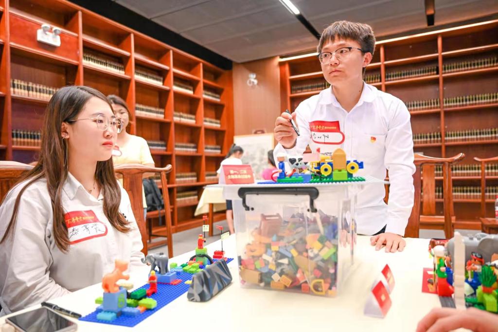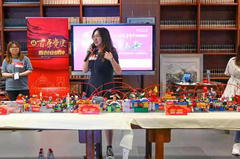 本站訊(記者劉曉艷 圖李天宇)面對一堆樂高零件,你能用它們搭建一座“你心中的黨員精神之塔”嗎?2021年6月19日下午,在天津大學圖書館日新書齋,30名大學生從這個問題開啟了一場奇妙的黨史學習之旅。在接下來將近4個小時的時間中,他們用樂高零件搭建起一個個場景:中共一大、國共第一次合作、南昌起義、長征、開國大典、改革開放、十九大……當所有的場景搭建完成,每位同學都會對自己所搭建的場景講一個生動的黨史故事,而最終所有的場景用紅色的“血脈”線連在一起,便鮮明地形成了共產黨人在百年征程中形成的精神譜系。