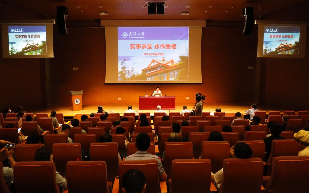 當天下午,指導組一行來到北洋園校區,參加了天津大學黨史學習教育專題黨課暨教工黨支部書記工作論壇專題報告。報告會上,李家俊以《實事求是,永作羹檣》為題面向校領導班子成員、各院級黨組織書記、教工黨支部書記、學生黨支部書記代表、專職組織員及黨務秘書以及學校黨史學習教育巡回指導組成員講授專題黨課。實事求是是黨的思想路線,也是天津大學的校訓。李家俊從實事求是思想是歷史的選擇、時代的需求、未來的堅守三個方面進行了深入系統地講解,黨課內容豐富、分析透徹,極具理論性和指導性。“實事求是是馬克思主義的精髓,是我們共產黨人的重要思想方法。我們過去取得的一切成就都是靠實事求是。今天,我們要把中國特色社會主義事業繼續推向前進,還是要靠實事求是。”李家俊向師生提出,要不斷加深對“實事求是”的理解,從中感悟初心使命、總結歷史經驗、把握發展規律,以扎扎實實的學習教育成效,加快推進一流大學建設,不斷開創學校各項事業發展新局面,以優異成績慶祝建黨100周年。