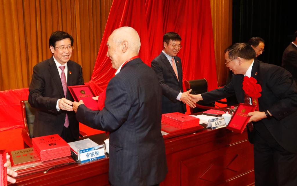 與會領導為獲得天津市教育系統、天津大學“兩優一先”稱號的先進集體、優秀個人頒獎。