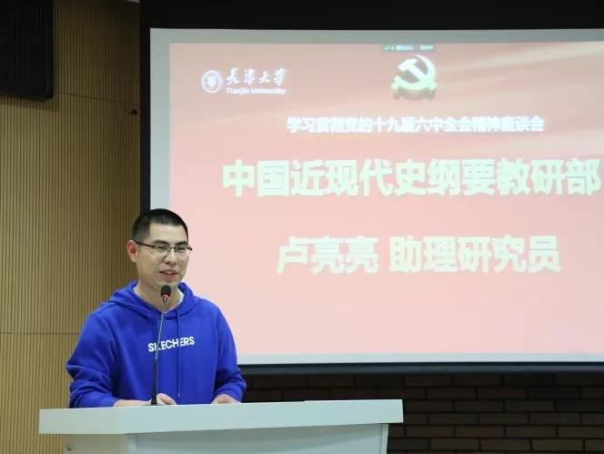 本站訊(通訊員 張鷟)為深入學習宣傳黨的十九屆六中全會精神,推動學習宣傳和研究闡釋深入開展,進一步把思想和行動統一到中央部署和要求上來,11月19日,天津大學黨委宣傳部與馬克思主義學院共同舉辦的學習貫徹黨的十九屆六中全會精神座談會在33教學樓召開。宣傳部部長呂靜,副部長李嘉毅、劉一,馬克思主義學院院長顏曉峰參加會議,與馬克思主義學院全體師生黨員和宣傳部黨支部全體黨員共同展開學習和研討。會議由馬克思主義學院黨委書記徐斌主持。與會師生圍繞《中共中央關于黨的百年奮斗重大成就和歷史經驗的決議》和習近平總書記關于《決議》的說明,交流學習體會,進行主題發言,并提出了抓實學習的目標任務和貫徹落實的工作著力重點。