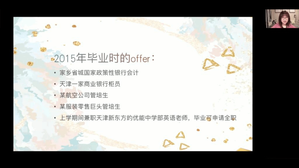 針對同學們較為關注的高校崗位,活動邀請到2016級翻譯碩士武千茹、2018級翻譯碩士張琦、高小雅等人,向同學們講述選擇輔導員工作的初心以及入職后的成長收獲,并邀請2014級外國語言學及應用語言學碩士孫千惠與2015級翻譯碩士田添對高校教學崗位的實際要求作了詳細的分享。
