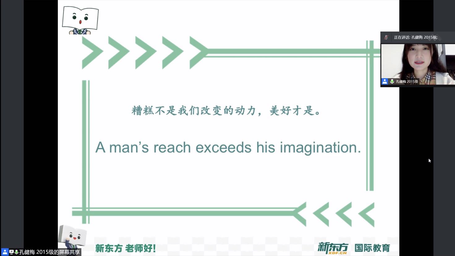 同時,為解答同學們對于中小學教師崗的困惑,活動邀請到就職于天津市第一中學的2018級翻譯碩士王心、就職于深圳市大鵬新區教師崗的2018級翻譯碩士吳晨鈺以及就職于天津外國語大學附屬濱海外國語學校的2018級翻譯碩士崔月三人,對成為教師所要必備的素質進行了介紹。就業于北京新東方的2015級翻譯碩士孔健梅也向同學們講述了她的心得體會,并細致講解了相關的職業成長及規劃,使參會同學加深了對于未來求職的規劃和思考。