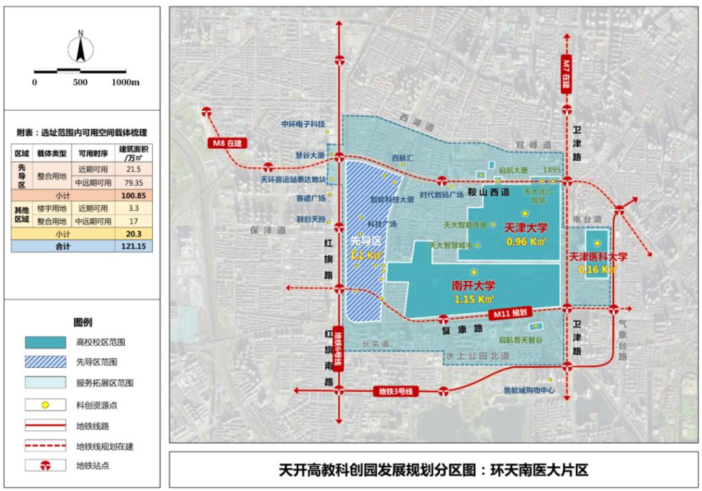核心區內劃定“鞍山西道—白堤路—復康路—紅旗路”合圍區域為先導區,占地面積約1.1平方公里。以天津科技廣場為核心、科研西路為中軸向兩側延伸的11個空間載體為主要供給,可提供總占地面積22.05萬平方米、總建筑面積100余萬平方米的載體空間。